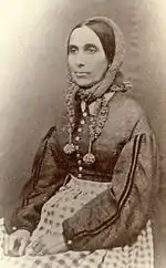 The regiment was mainly made up of men from Concord and Exeter, led by Col. Gilman Marston.[1] Dame marched and camped alongside the troops, often as the only woman among a thousand men.[3] [6] She was appointed matron of the 18th Army Corps hospital in September 1864. Her duties included supervising other nurses, and cooking for the hospital patients, often numbering in the thousands.[7] Marston said of her: "Miss Dame was the bravest woman I ever knew. I have seen her face a cannon battery without flinching while a man took refuge behind her for safety from flying shells. She was always present when most needed."[5] She saw action at first Bull Run, second Bull Run, Fredericksburg, and Gettysburg.[5] Dame's tending to the men went beyond medical attention; she would sometimes pick strawberries for the wounded, or write letters home for them.[8] Dame's nursing duties varied as well; sometimes she would oversee supplies, other times she would investigate the sanitary conditions of other regiments.[7] Dame remained at this hospital until the end of active war operations, when she reconvened with the 2nd New Hampshire Regiment. On December 25, 1865, the regiment was mustered out of service, ending Dame's service.[9]