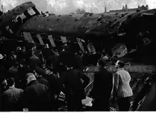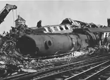 On 8 October 1952, at around 8:17 a.m., the local train stopped at platform 4 at Harrow and Wealdstone station, approximately seven minutes late because of fog.[4] Carrying about 800 passengers, it was busier than usual because the next Tring-Euston service had been cancelled.[6] As scheduled, it had travelled from Tring on the slow line, switching to the up fast line just before Harrow and Wealdstone to keep the slow lines to the south of the station clear for empty stock movements.[7] At 8:19 a.m, just as the guard was walking back to his brake van after checking doors on the last two carriages, the Perth express crashed into the rear of the local at a speed of 50–60 miles per hour (80–100 km/h).[8][9] It had passed a colour light signal at caution and two semaphore signals at danger, and had burst through the trailing points of the crossover from the slow lines, which were still set for the local train.[5] The collision drove the entire local train forward 20 yards (18 m), and completely destroyed the rear three coaches, shattering the wooden bodies of the last two and crushing the steel body of the next to a third of its length; the three were telescoped into the length of little more than one coach. The leading two vans and three coaches of the Perth train piled up behind and above the locomotive.[10]
