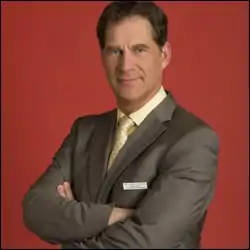 Reviewing the 2002 episode in which Harry attends to a fairground disaster, The Guardian's Rupert Smith deemed MacCorkindale "fantastically wooden". He described the plot as "ridiculous", highlighting the convenience of Harry happening to be present when the incident occurred.[35] The following year, Smith again highlighted credibility issues with a plot which revealed Harry to be a friend of photographer Patrick Lichfield, writing that the revelation was "one of the most throwaway bits of exposition ever seen in British television drama."[36] Fellow Guardian critics Sarah Dempster and Jim Shelley have both commented on MacCorkindale's "loud" delivery of his lines, with Shelley deeming Harry a "human Foghorn Leghorn",[37] and Dempster describing Casualty as being "Above all [...] about Simon MacCorkindale, shouting. Then panting, alarmingly, as he peers through some blinds. And then shouting again."[38]