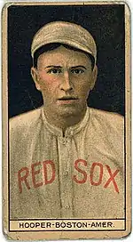 Breaking into the majors with the Red Sox in 1909, Hooper played in 81 games and hit .282.[13] Between 1910 and 1915, he teamed with center fielder Tris Speaker and left fielder Duffy Lewis to form the Golden Outfield, one of the finest outfield trios in baseball history.[14] Religious differences may have been the biggest challenge for the Golden Outfield. At the time, a common Protestant sentiment was that Catholics would move to their communities and change the established culture. Speaker, who was a Protestant, once went a year without speaking to Hooper or Lewis, who were both Catholic.[15]