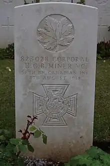 Miner's medals, including the VC and the Croix de Guerre, are on display at Huron County Museum in Goderich, Ontario. There is a plaque to his memory in his hometown of Cedar Springs; it was unveiled on 22 September 1963 by his brother Ross Miner. There is another plaque to him in the United Church at Cedar Springs. Branch 185 of the Royal Canadian Legion in Blenheim, Ontario, is named the Harry Miner Branch.[5] Branch 140 of the Royal Canadian Legion in Clinton, Ontario is also named after him.[6]