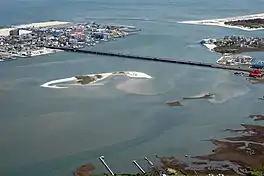 ![]() The Sinepuxent Bay traversed by the bridge; the mainland is at bottom right, Ocean City at top left. | |