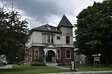 The Hartford Library is located in the village of Hartford, on the north side of Maple Street (Vermont Route 14), a short way west of the White River bridge. It is a domestically scaled 21⁄2 story wood-frame building, with a hip roof and an exterior clad in wooden clapboards on the upper levels and in red brick veneer on the ground floor. The roof faces have low and wide shed-roof dormers, and a pyramidal square tower rises at the southwest corner. A flared series of wooden shingle courses separated the two floors. The front entrance is sheltered by a gabled portico with a round-arched front.[2]