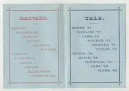 The 1876 game was the first won by Yale, and the first game Walter Camp played in. Eugene V. Baker was the captain. O. D. Thompson scored on Harvard.[66]