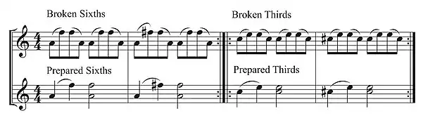 Developing Double Stops is divided into seven sections. The first four sections develop sixths, thirds, octaves, and fourths in first, third, second, fourth and fifth positions respectively, as well as exercises to practice shifting between each of the positions. The following sections are more advanced, focusing on octave, fingered-octave, tenth, and chromatic double-stop scales and passages. In each section, double-stops intervals are trained systematically using ‘broken’ and ‘prepared’ intervallic exercises on each string set (see Figure 3). Whistler also employs various études from Sitt's 20 Etudes in Double Stops, Op. 32; De Beriot's Méthode de Violon, Op. 102; Leonard's Petite Gymnastique du Jeune Violoniste, Op. 40; and Blemenstengel's 24 Exercises for Violin, Op. 33, among others.
