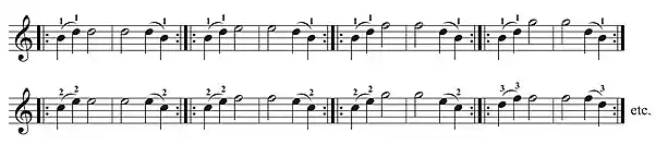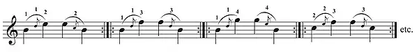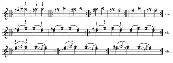 Upon completing the same-finger shifting exercises, students move onto new-finger classical shifts, shown in Figure 2. In these exercises, the same-finger shift is practiced again, but as a preparatory motion the new-finger placement. Whistler indicates this using an acciaccatura grace note, more commonly referred to as a guide note. Once the guided shift is complete, the new finger is placed. During initial stages of practice, the guide note should be heard and elongated. “As the student perfects [their] ability to shift from on note to another, the small [guide] note eventually should not be heard,” (emphasis in original).[38]