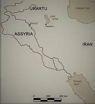 Hasanlu is an ancient Near Eastern site located in the Qadar River valley, on the southern shore of Lake Urmia in northwest Iran.[8][9] The city of Hasanlu was occupied consistently from the sixth millennium BCE to around 800 BCE, when the site was invaded and destroyed by fire.[9] In 1934–1936 Hasanlu was commercially dug by Sir Aurel Stein, a British archaeologist.[10] Then, in 1956, the Hasanlu Project was launched by the sponsorship of the University Museum of Pennsylvania, the Metropolitan Museum of Art, and the Archaeological Service of Iran.[9] Following the launch of the Hasanlu Project, a team of archaeologists from Penn Museum led by Director Robert H. Dyson excavated the site from 1957 to 1974.[10] This team completed nine excavation campaigns, and the excavation of the site ended more than 40 years ago (as of in 2022).