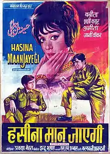 Hasina Maan Jayegi (lit. 'The Beauty Will Agree') is a 1968 Hindi film directed by Prakash Mehra. The film stars Shashi Kapoor, Babita, Ameeta, Yunus Parvez and Johnny Walker. The film's music, composed by Kalyanji Anandji, has songs which are quite memorable, with the melodious Rafi-Lata duet "Bekhudi Mein Sanam" being the most popular of them all. The film stood 9th in Box office collection for the year 1968. Shooting of the film started with the song "O Dilbar Janiye" at the now defunct Roop Tara studio.
