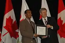Hassan Abdillahi "Karate" being presented with a NEPMCC Media Award by Prime Minister Stephen Harper at Seneca College (2009).