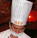 Toque | (informally, "chef's hat") A tall, pleated, brimless, cylindrical hat traditionally worn by chefs. |