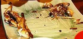 As a food source, the fish has mostly been sourced locally from the coastal region of the Sea of Japan, and has been designated the official prefectural fish of Akita Prefecture.[5] The fish, which is scaleless, may be prepared whole as braised or grilled fish, and has a mucilaginous consistency.[6] It is also dried to make stockfish; salted, dried, and made into himono; and cured in miso as misozuke. It is the main ingredient of the fish sauce called shottsuru.[7] The egg masses are known as burikko.[7] In Korean the fish is called 도루묵 dorumuk.[2]