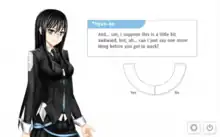 The first two endings involve *Hyun-ae leaving the Mugunghwa with the protagonist, either as a companion or lover.[27][28] In the third ending, the protagonist leaves without taking either AI with them (either by not saving the ship from meltdown in time, or by prematurely downloading the logs before the end of the AI commentary has been reached). This conclusion can also be reached if the player opts not to download the AI data during the final conclusion.[29] The fourth ending involves "kidnapping" *Mute, effectively relieving her of her duties on the ship.[30] The fifth ending, which can only be accessed by "cheating" (searching manually for a log which would not normally appear on the story branch in question), involves taking both AIs as a harem.[31] The game can also end by penalty for disagreeing too much with an AI, causing the angered AI to permanently disconnect the protagonist from the ship's computer,[32] or by the "bad priorities" ending, which occurs when the player downloads the logs during the meltdown sequence, which takes too much time, killing them in the explosion.