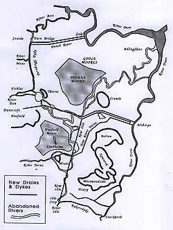 The eastern branch of the Don river was blocked and the banks of the northern branch into the River Aire were raised.[10] The northern branch was originally a Roman navigation channel called Turnbridgedike. A 2-mile (3.2 km) bank which ran along the south side of the river from Fishlake to Thorne included a navigable sluice, to allow boats to reach Sandtoft. Lifting gates gave access to a lock chamber which was 50 by 15 feet (15.2 by 4.6 m). Beyond Thorne, a further bank ran for 5 miles (8 km) to the Aire. The River Idle was blocked by a dam and its waters were diverted into the River Trent at Stockwith along Bycarrs Dyke. A 5-mile (8 km) barrier bank was constructed along the northern edge of the channel, from the dam to the River Trent. The Torne was embanked and straightened by cutting a drain which emptied via a sluice into the Trent at Althorpe. An 8-mile (13 km) drain was cut from where the Idle had been blocked to Dirtness, passing under the Torne at Tunnel Pits. At Dirtness it was joined by another drain, bringing water from the west, and then ran for a further 5 miles (8 km) to another sluice at Althorpe. The work was on a scale not previously seen in England, and Vermuyden's contribution was recognised when he was knighted in January 1629.[11] In 1629, a Court of Sewers for the Level of Hatfield Chase was established by Royal Warrant.[9]