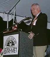 Construction of the Westside MAX project began in 1993. In November 1996, Hillsboro and TriMet named the yet-to-be-completed station at the western end of the project as the Mark O. Hatfield Government Center Station.[1] Hatfield was retiring from 30 years as U.S. Senator and previously used his political clout as Chairman of the Senate Appropriations Committee to ensure funding for the project.[1] In June 1998, after completion of the station but prior to its opening, government officials held a dedication ceremony at the station.[2] Hatfield, who had by then retired, was in attendance as the station was officially dedicated in his honor.[2]