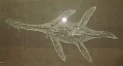 The holotype specimen of Hauffiosaurus, housed in the Hauff Museum, is an almost complete and articulated skeleton, found from the Posidonien-Schiefer, dating to early Toarcian stage of the Early Jurassic. The holotype specimen preserved in a single block of the original matrix, exposed in ventral view. The body outline visible around the specimen is an artifact of preparation, not preservation; no remains of soft tissue were preserved.[1] The skeleton was discovered during the early 19th Century,[3] in beds of the famous Posidonien-Schiefer lagerstätte at Holzmaden, Baden-Württemberg, in southeastern Germany. However, it was not recognized as a valid taxon, and no thorough description of the fossil was made until 2001.[1]