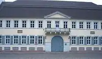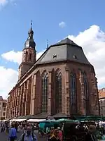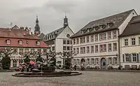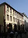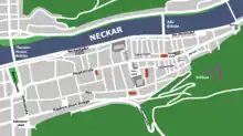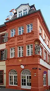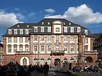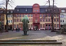 The Hauptstrasse runs right through the Altstadt from Bismarckplatz in the west to the Karlstor in the east, with a slight bend following that of the Neckar river. Between Theaterstrasse and Universitätsplatz, there is a slight rise, which is caused by the alluvial fan of the now subterranean Klingenteichbach stream. The street is around 1.8 km long.[1] It is crossed by numerous streets running from north to south (mostly called Gassen, "alleys") and there are five squares along its route. One of these, the Marktplatz was planned as a market place from the beginning, while the other four - Anatomiegarten, Universitätsplatz, Kornmarkt, Karlsplatz - were created through the demolition of buildings.