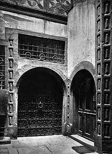 The vestibule originally served the Alte Hölle's staircase, which revealed the very old style of construction: once, the vestibule was open towards the yard and arbor-like vestibules with wooden parapets were located in front of the upper rooms. This construction method was common for timber-framed houses in Frankfurt's historic center, even in the early 20th century. However, as part of the construction of the Goldene Waage, Hamel had ceilings installed in the vestibule and thus created further rooms above it. Since the rooms were considerably shorter than the original rooms of the Alte Hölle and also were not at the same height as the rooms of the Goldene Waage, as can be seen in the cross-section of the house, a tower containing a spiral staircase was constructed between the two buildings. On the ground floor the staircase was accessible via a wooden door in the northern wall of the yard opening to Hell's Lane.