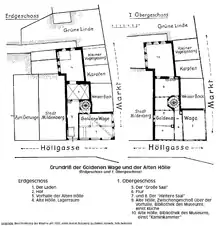The house on the corner of Höllgasse was mentioned as early as the Middle Ages, in 1323, known as House Kulmann or Colmann after the owner.[4] In 1405, it became one building with the house behind it, the Alte Hölle (Old Hell). Around this time the name Höllgasse (Hell's Lane) emerged, which described the densely built and extremely dark lane between the market square and Bendergasse, which was very narrow even for medieval times. There was also a house called Junge Hölle (Young Hell), located on the eastern side of Höllgasse, directly opposite Alte Hölle (Old Hell). Most of the houses on this side of the street were built with overhangs, which meant the first floor was on the property of the cathedral – much to the annoyance of the cathedral administration. The first legal case was recorded in 1299, when the goldsmith Colmann came into conflict with the clergy because his house was located on the eastern side of Höllgasse.[5]