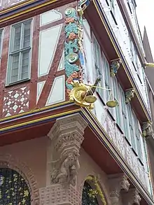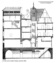 Above the ground floor there were two cantilevering half-timber framed floors, their gable side facing the market with two gable floors above. However, in comparison to the first floor the second floor protruded only on the side facing the market. The eastern side, facing the cathedral, displayed a very delicate design of the timber framing, which formed a pattern of saltires. The timber framing could be compared to the design at Schwarzer Stern, which had been built at Römerberg shortly before. In contrast to the Goldene Waage the Schwarzer Stern was rebuilt in the 1980s after its destruction in World War II. The timber frame of the upper floors also showed almost continuous rows of narrow windows on all sides. On the first floor there were eleven windows to the eastern side, six to the northern. On the second floor there were twelve windows to the eastern and four to the northern side. The glazing was completed around 1750.[5]