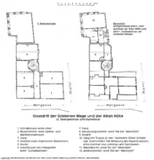 In order to evaluate the technical possibilities of the reconstruction, the city set up a project to document the old town in 2006.[8] The study found that none of the buildings could be historically reconstructed, not even the particularly well-documented Goldene Waage. A creative reconstruction, "in which the street facade and the basic layout, in particular, could be rebuilt and possibly extended," seemed possible. The historical city plan could only be partially reconstructed; in particular, because the house by the cathedral, the Goldene Waage, could no longer be rebuilt on its original site. In order to keep the excavations of the archaeological garden accessible, a superstructure was to be built, in which larger struts had to be incorporated. Further research was necessary to establish, for example, whether the historical level of the streets and ground floors could be maintained. The current building regulations had to be observed for each reconstruction, especially with regard to fire protection, energy efficiency and the possibility of safe escape routes. Stairwells had to be fire-proof and made of non-flammable materials.