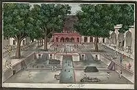 A Jharna or water fall emanating from the Hauz-i-Shamsi is located close to the Jahaz Mahal. It is identified as a significant water structure that had been developed by Nawab Ghaziuddin around 1700 AD as a pleasure garden during the Mughal rule. An underground pipe (still visible in ruins) supplied the runoff to the Jharna from Hauz-i–Shamshi. This was in addition to an open channel close by that carried the overflow of the tank to Tughlaqabad fort to enhance the drinking water supply.[6] The Jharna structure was built in three parts (pictured – painting from Metcalfe's album). The first part consisted of the reservoir or the tank, the second part was the water fall and the last part consisted of the fountains. Akbar Shah II built the pavilion on the side and his son Bahadur Shah II added the central pavilion, more in the style of hayat hakhsh pool in the Red Fort.[2] The Jharna, which was once the Mughal retreat and the highlight of the three-day festival of the Phool Walon Ki Sair, is seen now partly in ruins and the surroundings have been encroached upon (25 families are reported to be living here now). The water fall is seen more in the form of a drain in need of urgent restoration measures.[9]