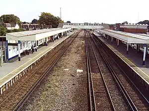 The first station at Havant was built in 1847 by the London, Brighton & South Coast Railway (LB&SCR) 500 metres to the east - a small wayside station (called Havant Halt). It was demolished after a serious fire. A newer station was then built 200 m west to serve the then new London & South Western Railway (L&SWR) Portsmouth Direct Line. This station was demolished so that a bigger station could be built 300 m further west to serve the new Hayling Island branch line.[3] It had three platforms, one for Hayling Island[4] and two for the stopping main line services.