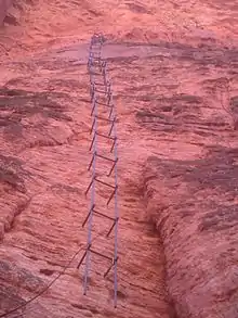 Mining interests also had a presence in the canyon in this period. Tunnels are a familiar sight in the campground area with the deepest of them around 300 feet (91 m). The largest of the mines is in Carbonate Canyon, adjacent to Havasu Falls, where rails and timbers still can be found descending three levels. Lead was mined here for the last time during WWII. Ranger Gale Burak, who worked at the Grand Canyon for several years, spoke of her experiences as a cook for the Havasu Lead and Zinc Company hard rock mining camp,[15] where the campground now resides. Below Mooney Falls, the famous pipe "ladder" ascended to a vanadium deposit.