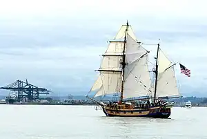In the winter of 2004, she was sold to a Cape Cod sailing program and renamed the Spirit of Larinda; however, due to the unexpected death of her owner, she remained inactive. In October 2005, the Grays Harbor Historical Seaport Authority, owner of Lady Washington, purchased her to add to its fleet. Returning to her original identity as the Hawaiian Chieftain, she joined up with the Lady Washington on February 25, 2006 to provide joint education and sail training up and down the west coast of the United States.[3] In February, 2020, GHHSA announced they would be retiring Hawaiian Chieftain to focus on operation of Lady Washington.[4]