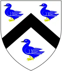 - Per research conducted by Sheila Yeo of the Yeo Society,[23] based on stained glass depictions of Yeo arms in churches of Petrockstowe (Yeo of Heanton Satchville) and Hatherleigh (Yeo of Hatherleigh) both in Devon. The ducks are described as of various breeds by different sources. Heraldic sources give contradictory tinctures: Argent, a chevron between three shovelers sable (Vivian, p.834) and Argent, a chevron between three mallards azure (Pole, p.510). The Yeos quartered the arms of Sachville, Esse, Pyne, Jewe and Brightley.[24]