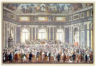 The first performance the next day was a private affair, but hundreds of people crowded into the street around the old Schwarzenberg Palace at the New Market to hear this eagerly anticipated work. Admission was by invitation only.[1] Those invited included wealthy patrons of the arts, high government officials, prominent composers and musicians, and a sprinkling of the nobility of several countries; the common folk, who would have to wait for later occasions to hear the new work, so crowded the streets near the palace that some 30 special police were needed to keep order. Many of those lucky enough to be inside wrote glowing accounts of the piece. In a letter to the Neue teutsche Merkur, one audience member wrote, "Already three days have passed since that happy evening, and it still sounds in my ears and heart, and my breast is constricted by many emotions even thinking of it."