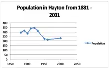 In the 2011 census the Office for National Statistics (ONS) identified a "Hayton (Allerdale) Built-up area", corresponding to the village, with a population of 237 in 94 households.[4] This figure was also the population recorded for the whole parish of Hayton and Mealo,[5] confirming that the village is the only settlement in the parish. The built-up area was calculated to be 0.081 square miles (0.21 km2),[4] while the area of the parish is 2.919 square miles (7.559 km2).[5] The ONS identifies built-up areas algorithmically.[6]
