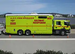 A hazardous material (hazmat) apparatus is a vehicle used by emergency services to respond to calls involving potentially hazardous materials. These vehicles are customized to fit the needs of the agency responsible for the apparatus, which may be a rescue squad, fire department, emergency medical services, law enforcement agency, or military.[1]