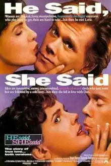 He Said, She Said is a 1991 American romantic comedy-drama film directed by Ken Kwapis and Marisa Silver. It stars Kevin Bacon and Elizabeth Perkins as two journalists working in the same office and falling in love with each other.