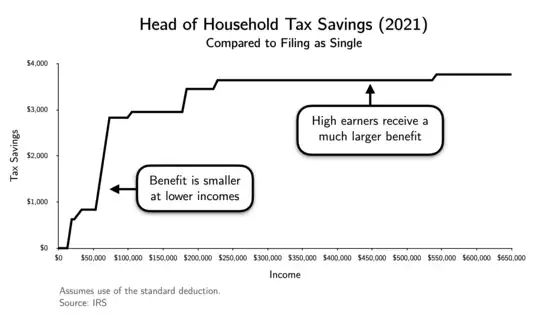 The Head of Household filing status was created in 1951 to acknowledge the additional financial burdens faced by single people caring for dependents.[3][1] Consequently, it provides single parents and other people caring for qualifying dependents with a larger standard deduction and preferential tax rates compared to single filers, reducing their tax liabilities (see chart).[4] In 2021, for instance, heads of households were entitled to an $18,800 standard deduction, compared to $12,550 for single filers.