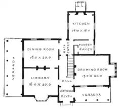 A probable reader of Downing's work, most notably The Architecture of Country Houses (1850), Headley decided to approach the architectural firm Downing & Vaux with designs in mind. He wished to preserve the semi-rural atmosphere and heritage of the land while still being able to boast an impressive residence.[5] Aside from accommodations to host guests, the Headleys also intended to raise a family in the house. With additional costs for construction, the house and property totaled to about $8,000, though Headley could have afforded more with his book royalties.[6]