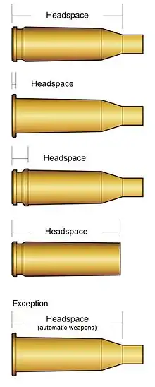 In firearms, headspace is the distance measured from a closed chamber's breech face to the chamber feature that limits the insertion depth of a cartridge placed in it. Used as a verb by firearms designers, headspacing refers to the act of stopping deeper cartridge insertion. The exact part of the cartridge that seats against the limiting chamber feature differs among cartridge and gun designs.[1] In general, bottleneck rifle cartridges headspace on their case shoulders; rimmed cartridges headspace on the forward surfaces of their case rims; and rimless pistol cartridges headspace on their case mouths. The case belts on belted cartridges were originally added to allow headspacing on the belt's forward surface, but in practice this is often vestigial and rifles chambered in belted cartridges may well headspace them on their shoulders.