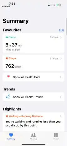 The Health app tracks and stores various health data and metrics, as well as clinical medical records for users with supported health insurers or hospitals signed up to the "Apple Health Records" program.[1] Data is divided into several categories: activity, body measurements, cycle tracking, hearing, heart, medications, mindfulness, mobility, nutrition, respiratory, sleep, symptoms, vitals, and other data. Users with a connected Apple Watch will have their health information from the device automatically imported into the health app including their activity rings, walking and running distances, flights climbed, mindfulness minutes, sleep analysis, handwashing, environmental noise levels, heart rate, blood oxygen levels, and ECG measurements.[1][2] Health data can also be logged manually or through third-party applications.