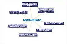 A health educator is "a professionally prepared individual who serves in a variety of roles and is specifically trained to use appropriate educational strategies and methods to facilitate the development of policies, procedures, interventions, and systems conducive to the health of individuals, groups, and communities" (Joint Committee on Terminology, 2001, p. 100). In other words, they conduct, evaluate, and design activities that pertain to the improvement of the health and well-being of humans. Examples of this include "patient educators, health education teachers, trainers, community organizers, and health program managers."[14] There is a variation in job titles and because of this, there is not a definite system of one health education system. In January 1978 the Role Delineation Project was put into place, in order to define the basic roles and responsibilities for the health educator. The result was a Framework for the Development of Competency-Based Curricula for Entry Level Health Educators (NCHEC, 1985). A second result was a revised version of A Competency-Based Framework for the Professional Development of Certified Health Education Specialists (NCHEC, 1996). These documents outlined the seven areas of responsibilities which are shown below. The Health Education Specialist Practice Analysis (HESPA II 2020) produced "a new hierarchical model with 8 Areas of Responsibility, 35 Competencies, and 193 Sub-competencies".[15]