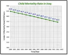 In the 1960s, Iraq was “one of the best countries in which to be a child” according to the UNICEF statistics. At the same time in 1981, Iraq had the 2nd lowest Infant Mortality Rate worldwide. In the late 1990s, Iraq's under-five mortality rates have dropped by approximately 50% - from 44.8 deaths per 1000 live births in 2000 to 34.4 in 2012.[14][15]