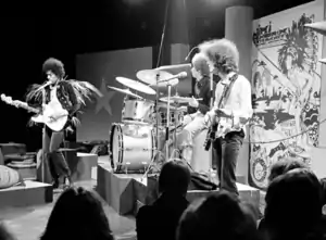 In March 1968, Hendrix recorded another impromptu performance of the song with Paul Caruso on harmonica, a friend from Hendrix's Greenwich Village days.[33] It was recorded at Hendrix's suite at the Drake Hotel in New York City, where he lived for a while during the recording of Electric Ladyland at the Record Plant.[34] Caruso described it as "very simple, pure, like Lightnin' Hopkins' earlier work."[33] It is included on West Coast Seattle Boy: The Jimi Hendrix Anthology released in 2010. For subsequent versions, Hendrix gradually developed "Hear My Train A Comin'" from a shorter, blues-oriented number into a longer, improvisational piece with extended guitar soloing as he had done with "Voodoo Child".[18] The transformation is apparent in three live recordings which were released in 1971, which range from over nine to twelve minutes. Hendrix performed a nine-minute version with the Gypsy Sun and Rainbows band at the Woodstock Festival on August 19, 1969.[35] Shadwick describes Hendrix's guitar solos as "fluently spectacular, stringing long, arching phrases together".[36] It was released on the Woodstock soundtrack follow-up album Woodstock Two, with the title "Get My Heart Back Together"[13] (reissued on Woodstock and Live at Woodstock). On May 30, 1970, during the Cry of Love tour, Hendrix with Mitchell and bassist Billy Cox were filmed performing the song at the Berkeley Community Theatre.[37] Several writers consider this rendition to be definitive,[18][38][39] including Shadwick: