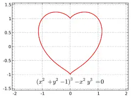 A number of parametrisations of approximately heart-shaped curves have been described. The best-known of these is the cardioid, which is an epicycloid with one cusp;[39] though as the cardioid lacks the point, it may be seen as a stylized water-lily leaf, a so-called seeblatt, rather than a heart. Other curves, such as the implicit curve (x2+y2−1)3−x2y3=0, may produce better approximations of the heart shape.[40]
