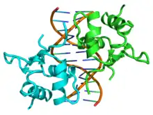 Structure of the dimeric DNA binding domain of the yeast heat shock factor (cyan and green) bound to DNA (brown) based on PDB: 3HTS.