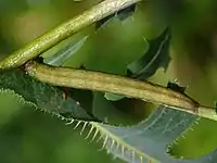 The larvae feed on flowers and seeds of Asteraceae species, especially Lactuca species.