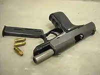 The P9 is a roller-delayed pistol manufactured from a stamped steel main frame and a polymer trigger guard. The stamped steel slide contains machined internal parts including a polygonally rifled barrel.[2] High-profile fixed sights are fitted with two red rectangles on the rear sight and a white stripe on the drift adjustable front blade sight. Vertical zeroing is accomplished by fitting front sights of a different height.[1]