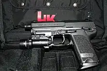 The USP Tactical (9mm Parabellum, .40 S&W, .45 ACP) incorporates fully adjustable suppressor height sights, an extended, threaded barrel with O-ring, and a match grade trigger with adjustable trigger stop. Prior to 2015, there was no USP Tactical model in 9mm. Instead, HK offered the regular "USP9" variant with an extended, threaded barrel and suppressor height sights as the "USP9SD" model.[8] Sound suppressors designed for the USP Tactical are available from Brügger & Thomet and Knight's Armament. A unique characteristic of the USP Tactical is that the barrel is left-hand threaded (counter-clockwise to tighten), which makes the pistol incompatible with suppressors designed for the MK23 Mod 0.[9]