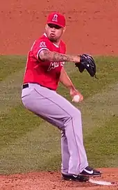 Santiago was traded to the Los Angeles Angels of Anaheim on December 10, 2013, in a three-team trade involving the Chicago White Sox, the Arizona Diamondbacks, and the Los Angeles Angels. The Angels received Tyler Skaggs along with Santiago, while the White Sox received Adam Eaton and the Diamondbacks received Mark Trumbo and two players to be named later.[8][9] In his first season in Anaheim, Santiago was fairly inconsistent, he averaged less than 6 innings per start and for a moment was sent to the bullpen, where he made 6 appearances while also starting 24 times for the Angels. In 127.1 innings, Santiago went 6-9 with a 3.75 ERA.