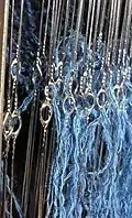 A heddle is an integral part of a loom. Each thread in the warp passes through a heddle,[1] which is used to separate the warp threads for the passage of the weft.[1][2] The typical heddle is made of cord or wire and is suspended on a shaft of a loom. Each heddle has an eye in the center where the warp is threaded through.[3] As there is one heddle for each thread of the warp, there can be near a thousand heddles used for fine or wide warps. A handwoven tea-towel will generally have between 300 and 400 warp threads[4] and thus use that many heddles.