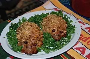 "Hedgehogs" may also be created by moulding ground meat in a teardrop shape, embedding pastry slivers or slivered almonds in the surface to resemble quills, and adding eyes and ears of peppercorns, olives, or whole almonds. The technique dates back to at least 1390,[13] and was referenced in an episode of Two Fat Ladies.