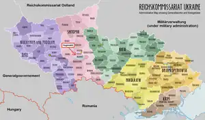 Hegewald was a short-lived German colony during World War II, situated near Zhytomyr in Reichskommissariat Ukraine. It was repopulated in late 1942 and early 1943 by Volksdeutsche settlers transferred from occupied territories of Poland, Croatia, Bessarabia, and the Soviet Union to an area earmarked for the projected Germanization of the Ukrainian lands. Plans were prepared months in advance by the SS, RKFDV and VoMi, but major problems with supplies occurred right from the region's initial establishment.[1] Himmler's original plans to recruit settlers from Scandinavia and the Netherlands were unsuccessful.[2]