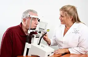 The Heidelberg Retinal Tomography is a diagnostic procedure used in ophthalmology. The Heidelberg Retina Tomograph (HRT) is an ophthalmological confocal point scanning laser ophthalmoscope[1] for examining the cornea and certain areas of the retina using different diagnostic modules (HRT retina, HRT cornea, HRT glaucoma). However, the most widely used area of application for HRT is the inspection of the optic nerve head (papilla) for early detection and follow-up of glaucoma. The procedure has established itself as an integral part of routine glaucoma diagnostics alongside the visual field examination (perimetry), the chamber angle examination (gonioscopy) and the measurement of intraocular pressure (tonometry). The HRT is the most widely used application of confocal scanning laser ophthalmoscopy.[2]